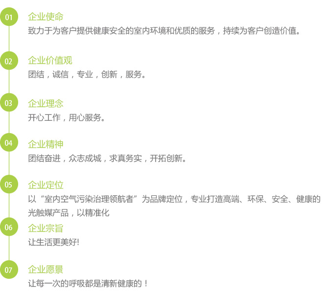 公司始终秉承"客户为本、诚信经营、科技为首、品质第一"的企业经营理念。务实、责任、进步、创新为宗旨。公司以持续改善室内环境、保护人类安全健康为己任、不断进行技术研发和创新、不断提升产品的品质和服务、服务全球市场、为人类提供一流的室内治理产品和解决方案。